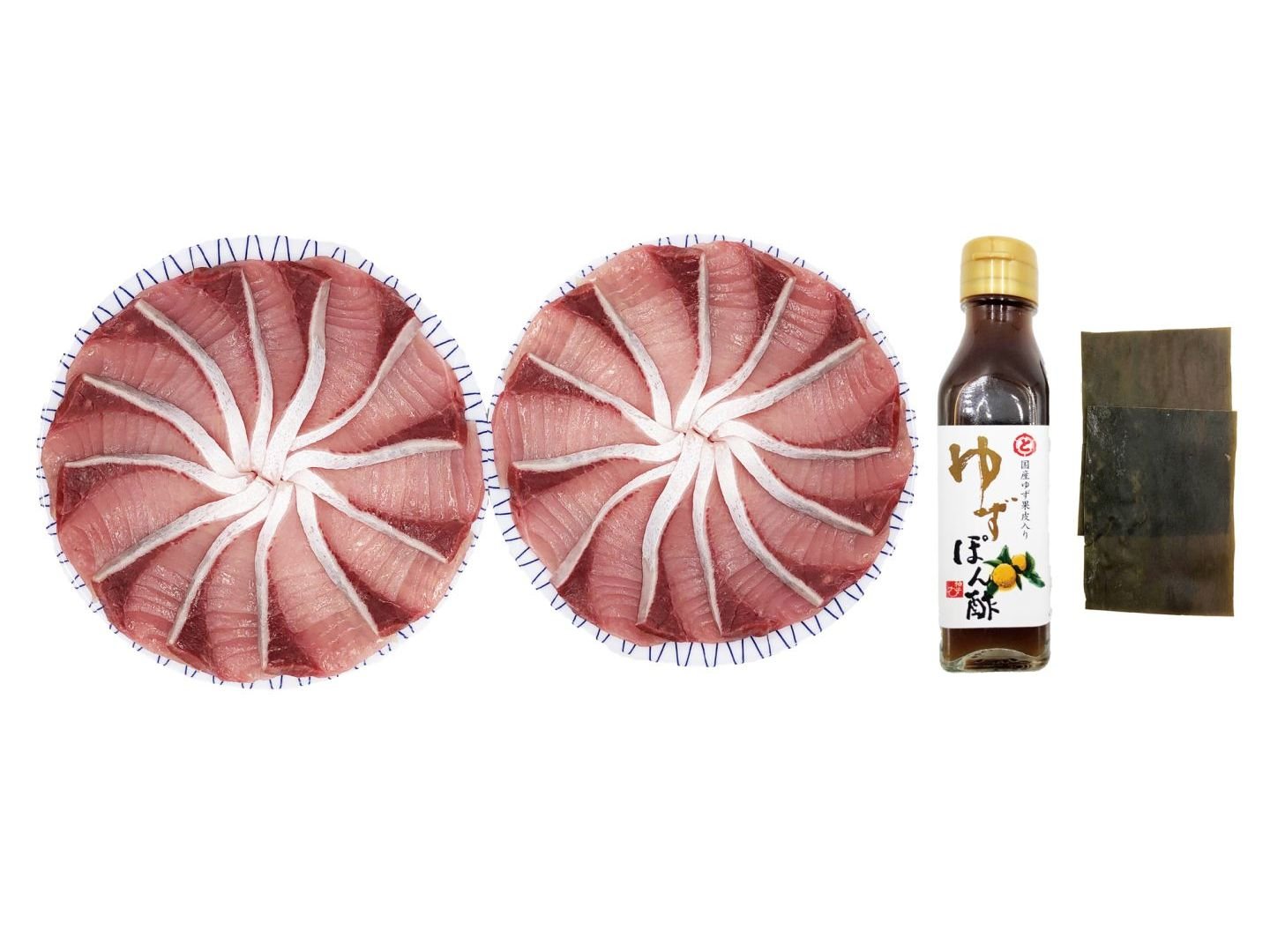 内容:ひみ寒ぶりしゃぶしゃぶ用200グラム×2皿(1皿は1~2人前)、だし用昆布3グラム×2枚、柚子ぽん酢120ミリリットル×1本(9,720円)