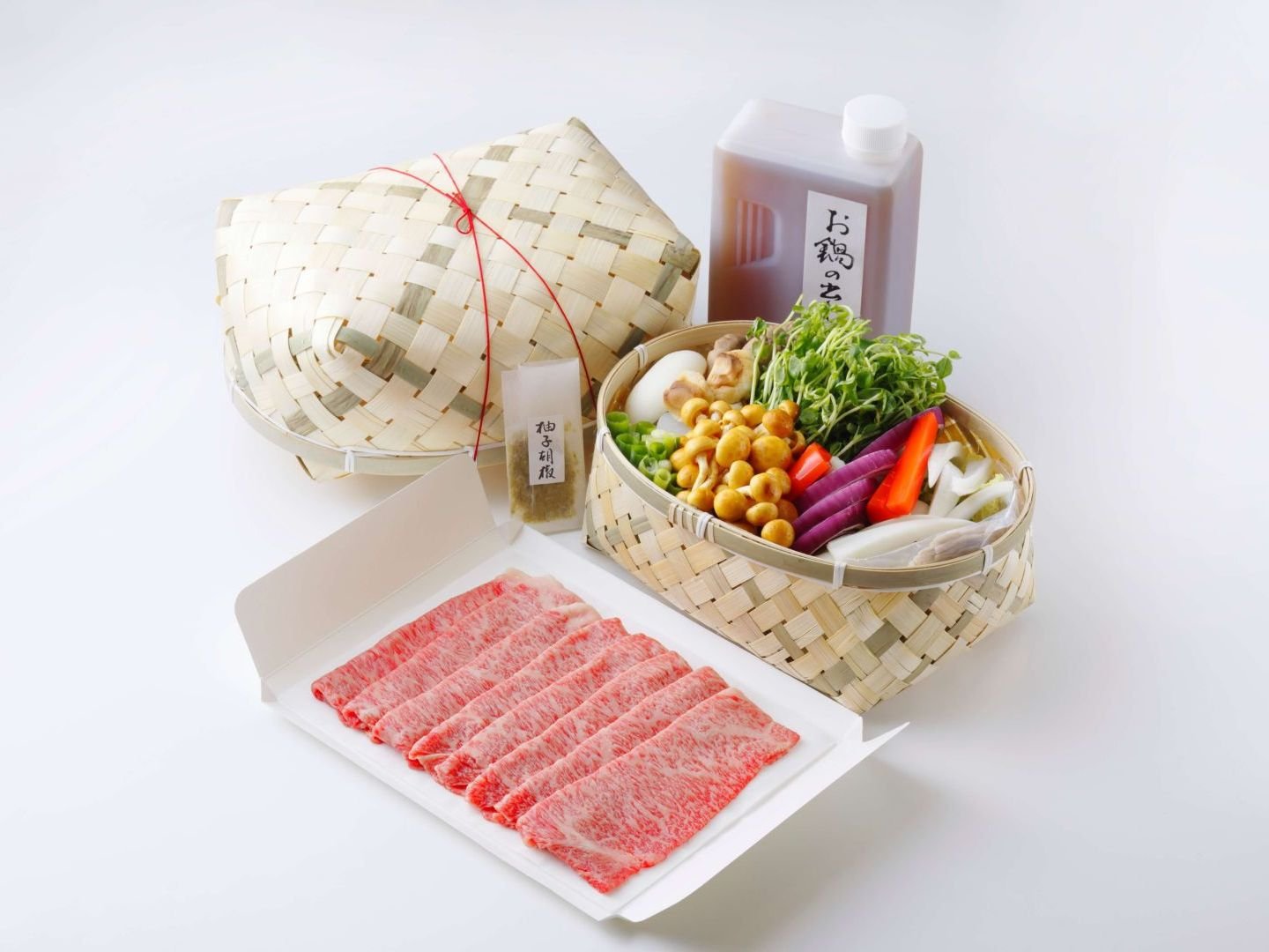 内容(2人前):牛サーロイン、九条葱、赤玉葱、白菜、丸大根、豆苗、なめこ、エリンギ、金時人参、お麩、小餅、蓮根麺、柚子胡椒、特製だし(16,200円)