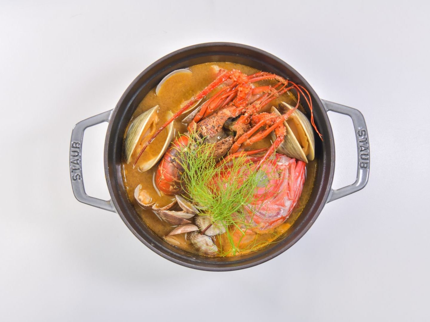 房総の持続可能な漁業と豊かな海を守るというコンセプトでつくられたブイヤベースは、環境にやさしい漁法で水揚げされた伊勢海老と金目鯛と貝類が素材だ。魚のアラや香味野菜と煮込んだだしをベースにした自家製ブイヤベーススープと合わせて煮るだけで絶品鍋が完成する。締めは海の恵みたっぷりのスープをリゾットに。