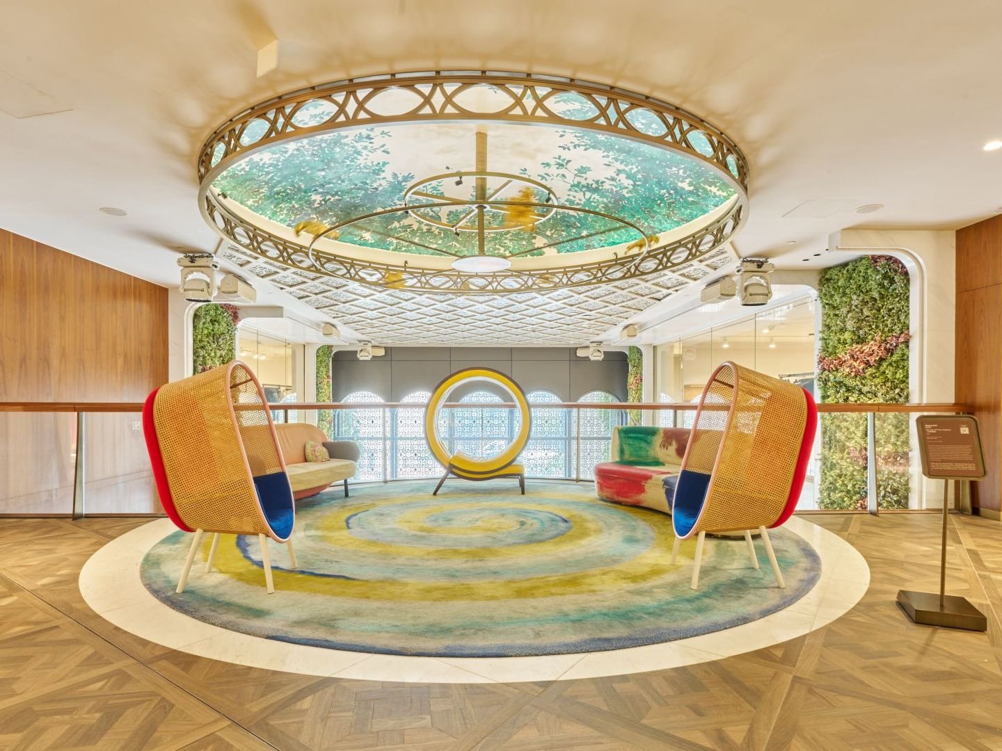 上海を拠点とするアーティスト・張 恩利氏の作品『Parrots of Five Colours』。ドーム型の天井には空中庭園をイメージしたグリーンの色彩、床には渦巻きが描かれ、天界の海の中心にいるような幻想的な雰囲気を体感できる。頭上の5羽のオウムは中国哲学の五行を象徴し、世の中の相互関係と自然の複雑さを表現。