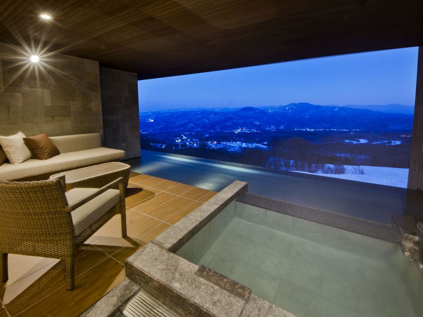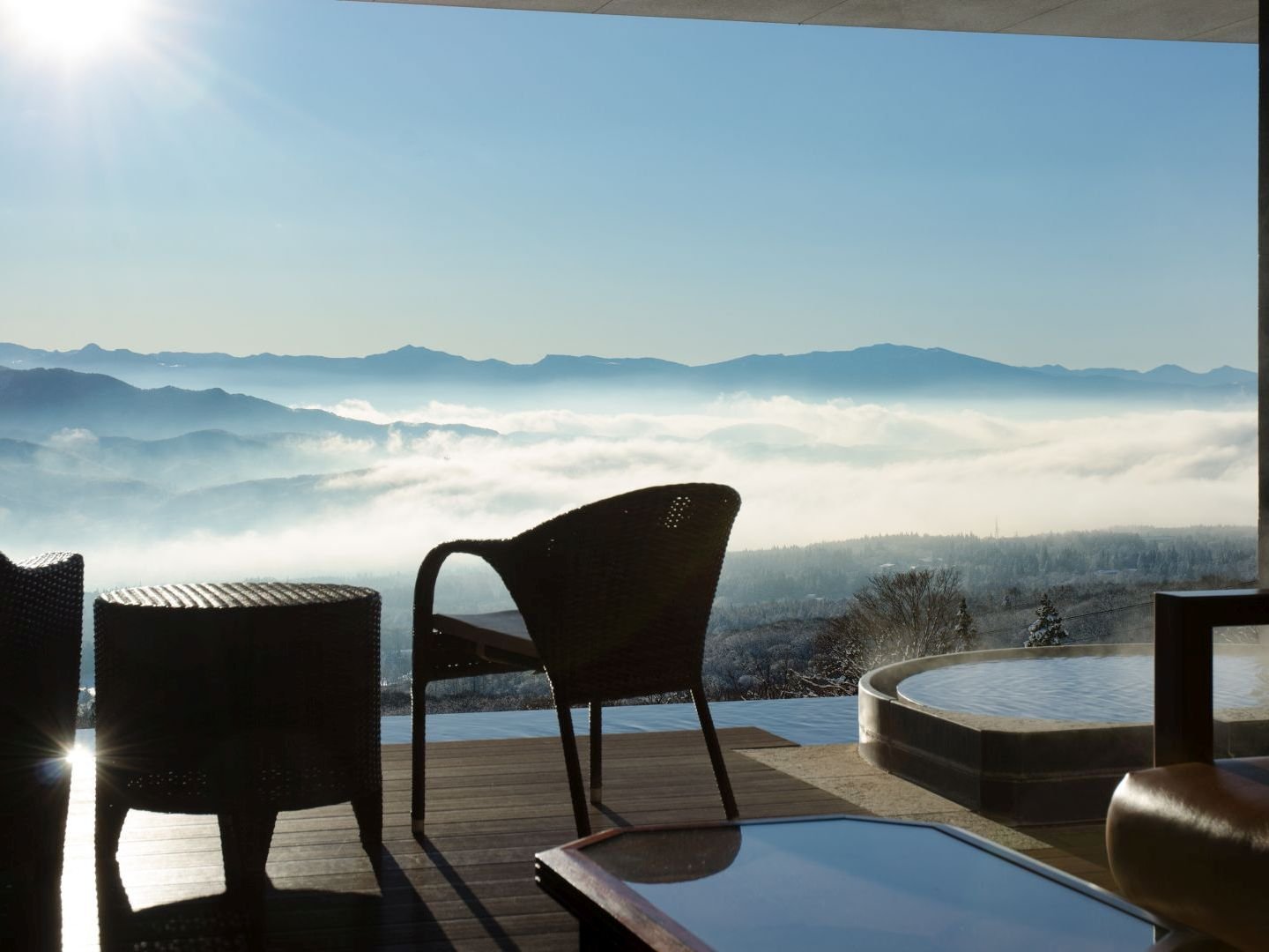プレミアム棟の露天風呂付客室。テラスにある露天風呂は深めの設計で、ゆったりと湯あみを楽しめる。