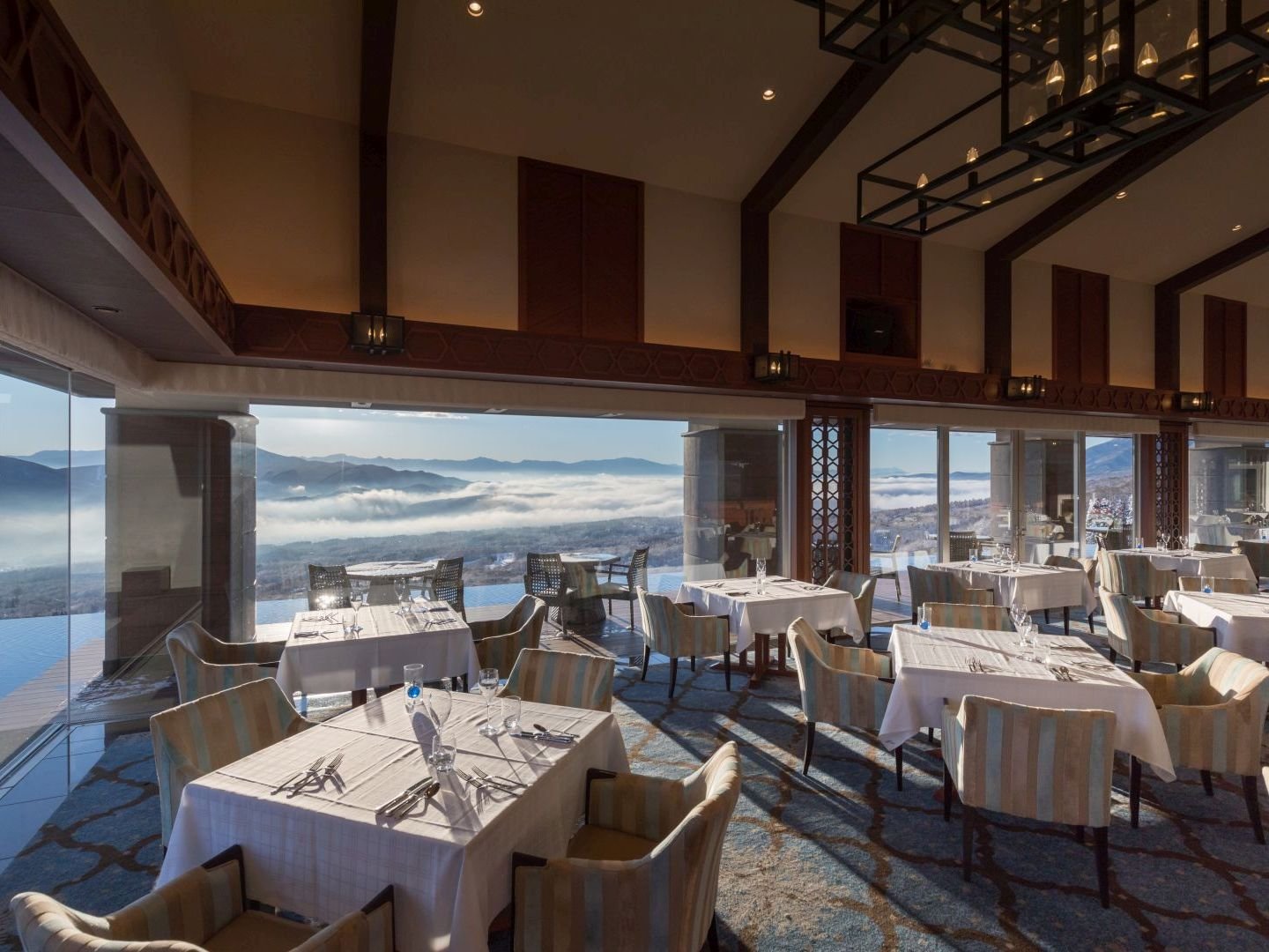 赤いじゅうたんが敷かれた格調高いインテリアのメインダイニングでは、多くの賓客をもてなしてきた正統派フレンチを。一方、プレミアム棟の「アクア ダイニング」では、遮るもののない絶景とともに洋食創作料理を味わえる。源泉かけ流しの温泉を楽しめる大浴場や、客室からの眺めも開放感たっぷり。白銀の世界に包まれる冬も美しい。