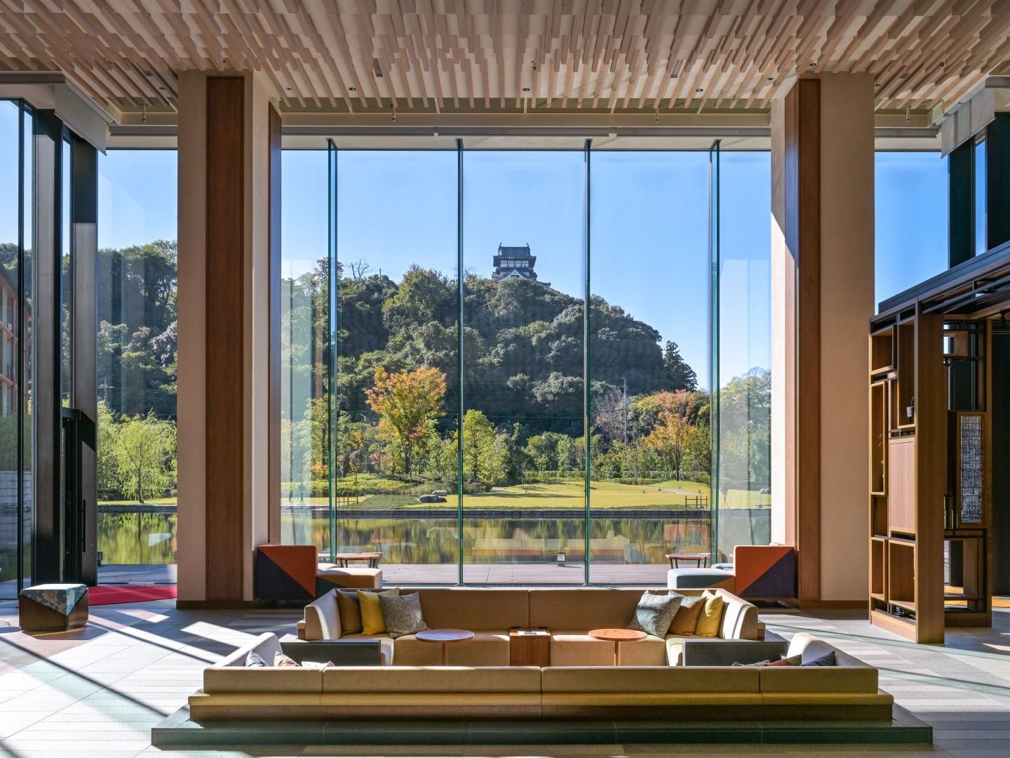 ロビーに入ると正面に犬山城が見え、思わず息を吞む。和風建築の伝統を取り入れながら、館内はモダンで居心地がよい。