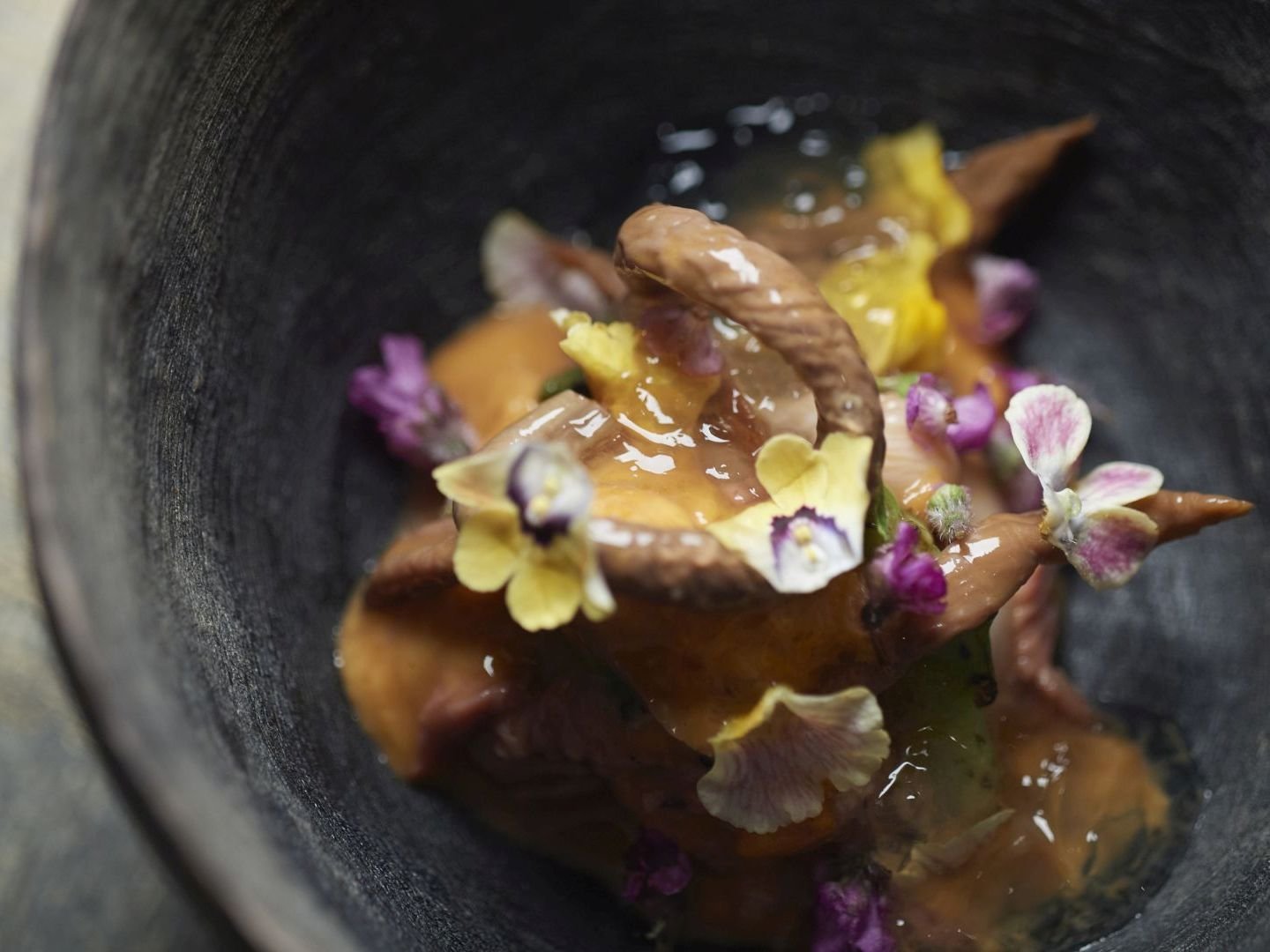 ゼンマイとウニに、ツキノワグマもも肉の薪火焼きを合わせたひと皿「月ノ輪熊」。