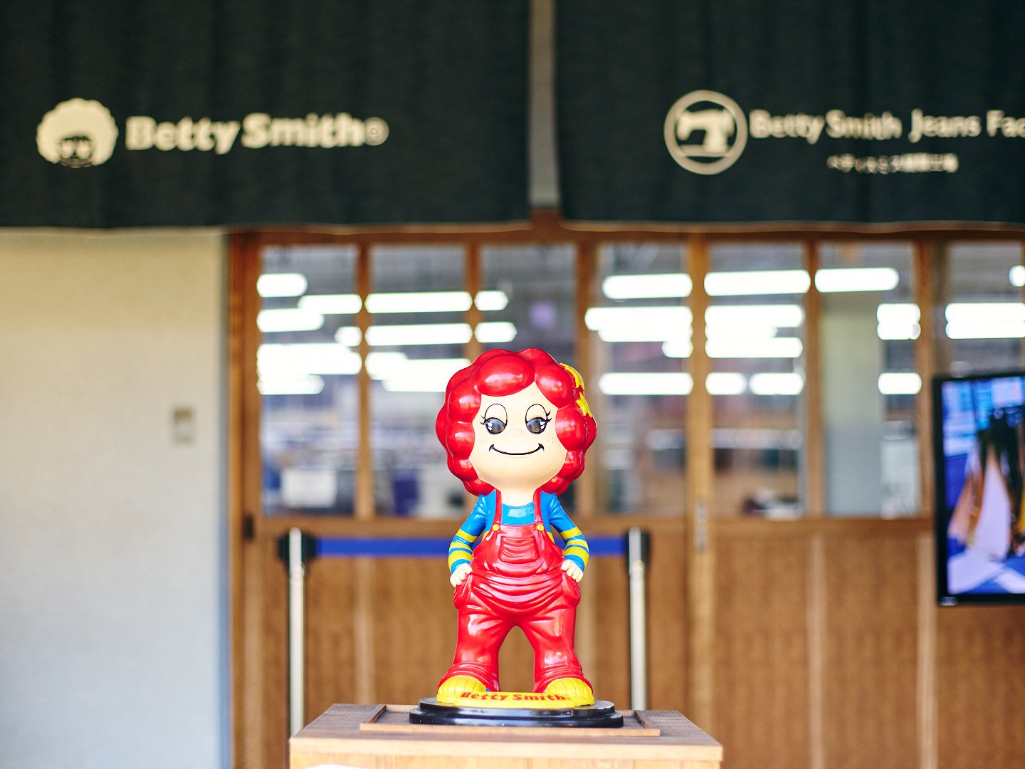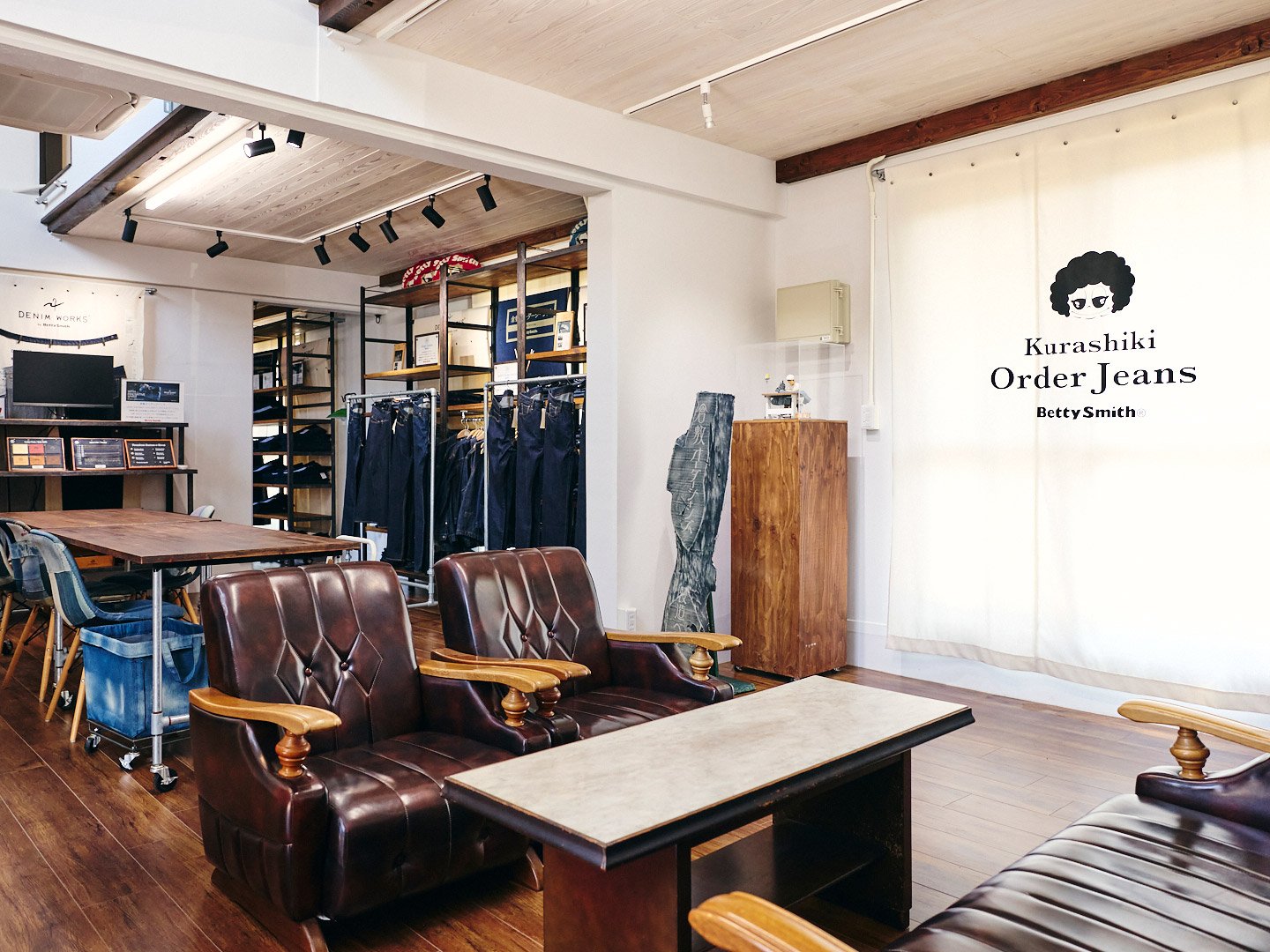 ベティズストアのエントランス天井には実物のジーンズが吊り下げられており、来訪者を楽しませている。