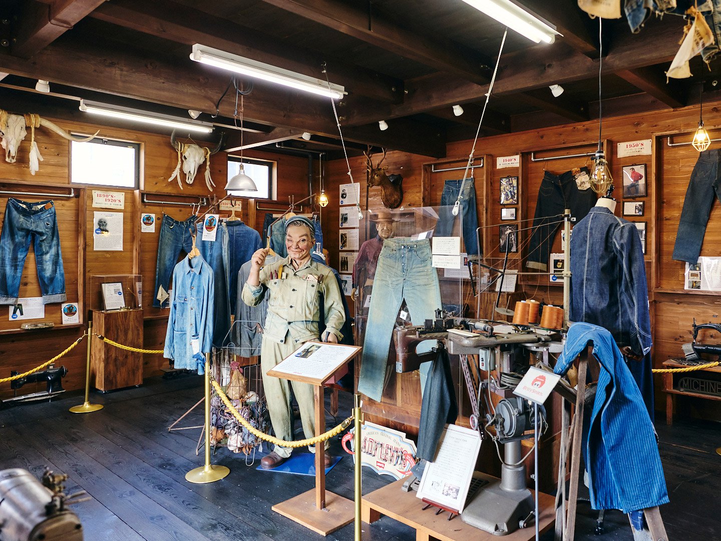 ミュージアム2号館には創業当時に使われていたミシンや機械などの道具を展示。国産ジーンズがどのようにつくられているかを知ることができる。