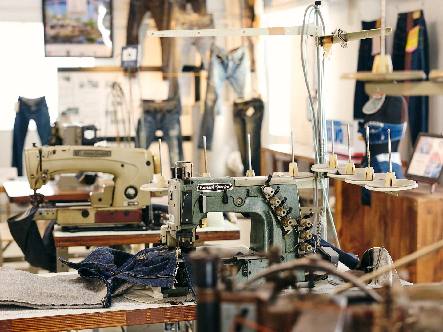 「倉敷オーダージーンズ®」の工房。完全予約制なので、世界で一本しかない自分好みのジーンズづくりにじっくりと向き合える。
