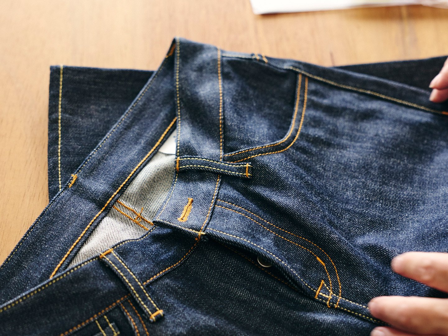 「“ジャケットにも合わせられる大人向けジーンズ”というコンセプトでDENIM WORKSをつくり始めました。年を取るとウエストのサイズだけ大きくなってしまって、それに合わせてジーンズを買うと、脚まわりがゆるくカッコ悪くなってしまうんですよ。そうならないために、履き心地とすっきり見えるシルエットを追求しました。一般的なジーンズはウエストベルト(腰まわりを補強する帯状のパーツ)が直線裁ちなんですけど、腰のラインに沿うように裁断したカーブベルトを採用したことで、履いたときのフィット感がよくなります。縫製にもこだわっていて、美しさを表現したい部分は新型のミシン、味わいを表現したい部分には旧式のミシンと、使い分けています。それから、日本の水が軟水であることもあって、インディゴのブルーが濃く出てきれいなんですよ。その色を楽しんでもらおうとワンウォッシュ(製品化される前に一度だけ水洗い処理を施すこと)にとどめています」