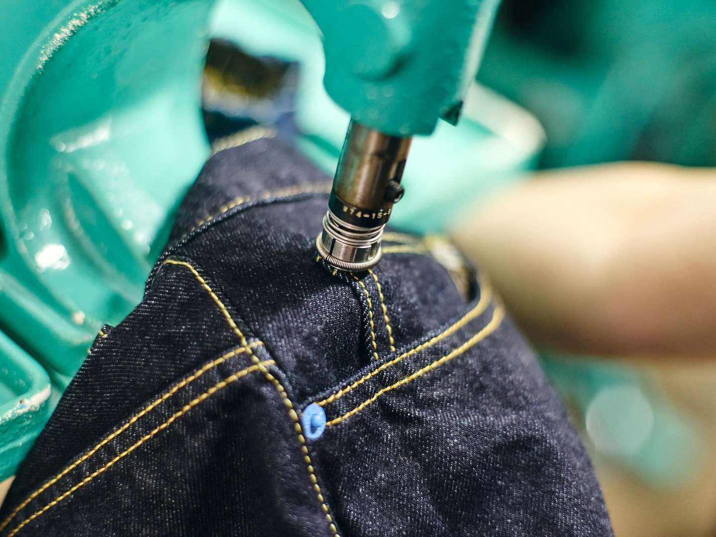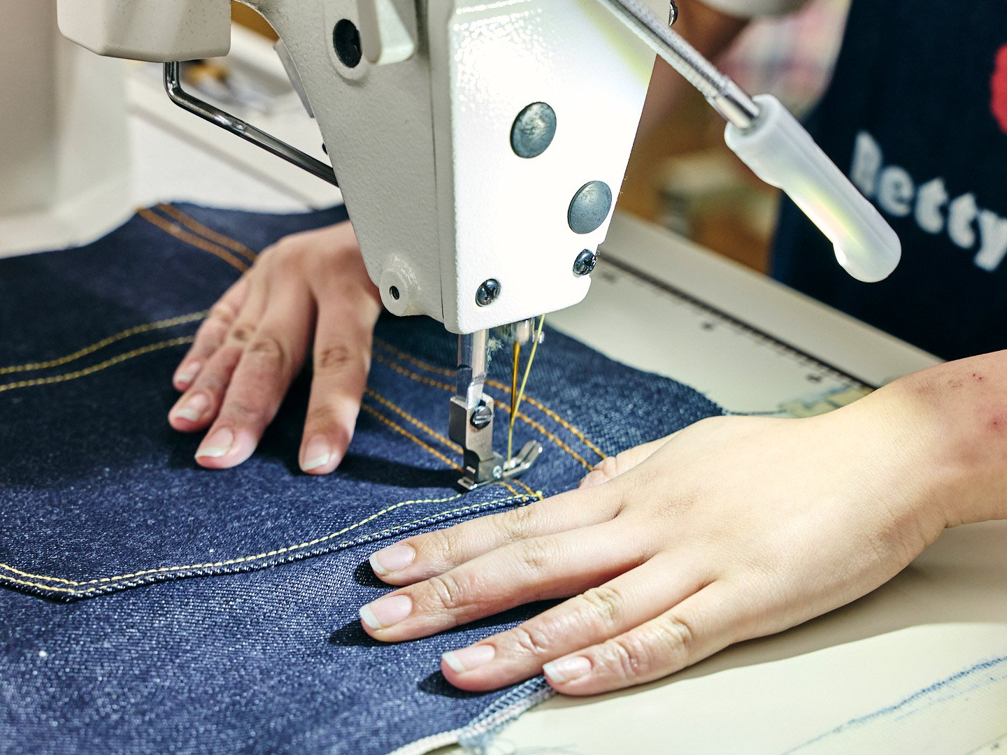 ジーンズの後ろ側となるデニム生地を縫い合わせる工程。デニム生地が何重にも重なっているため高い縫製技術が求められる。