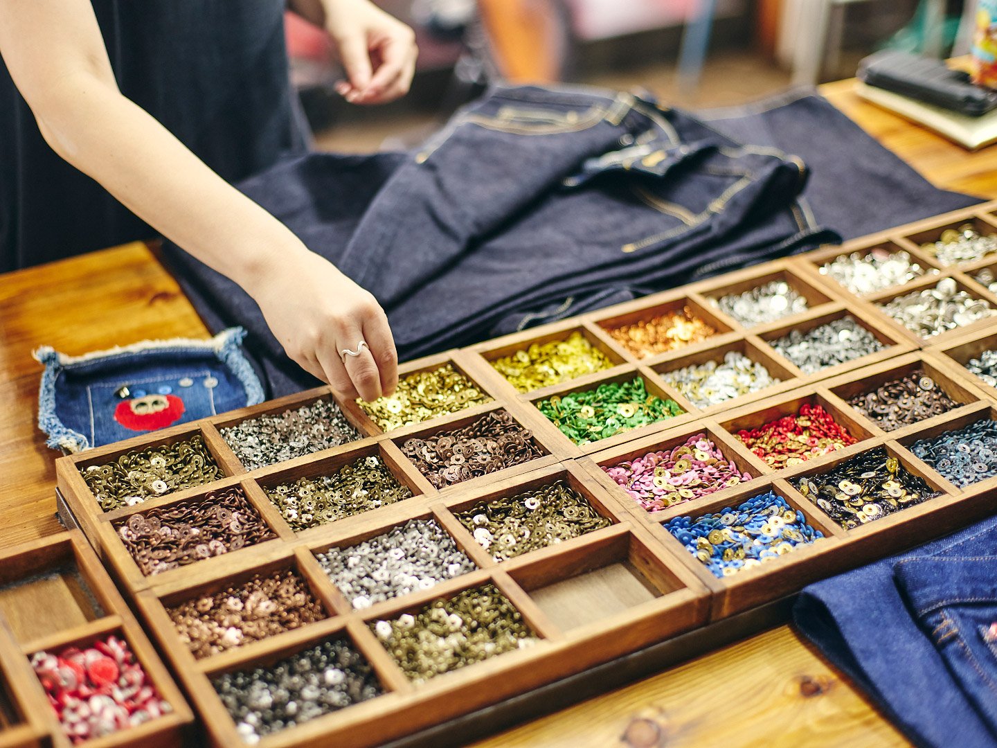 ジーンズ作り体験では、多様なデザインのパッチ、ボタン、リベットから好きなものを選べる。