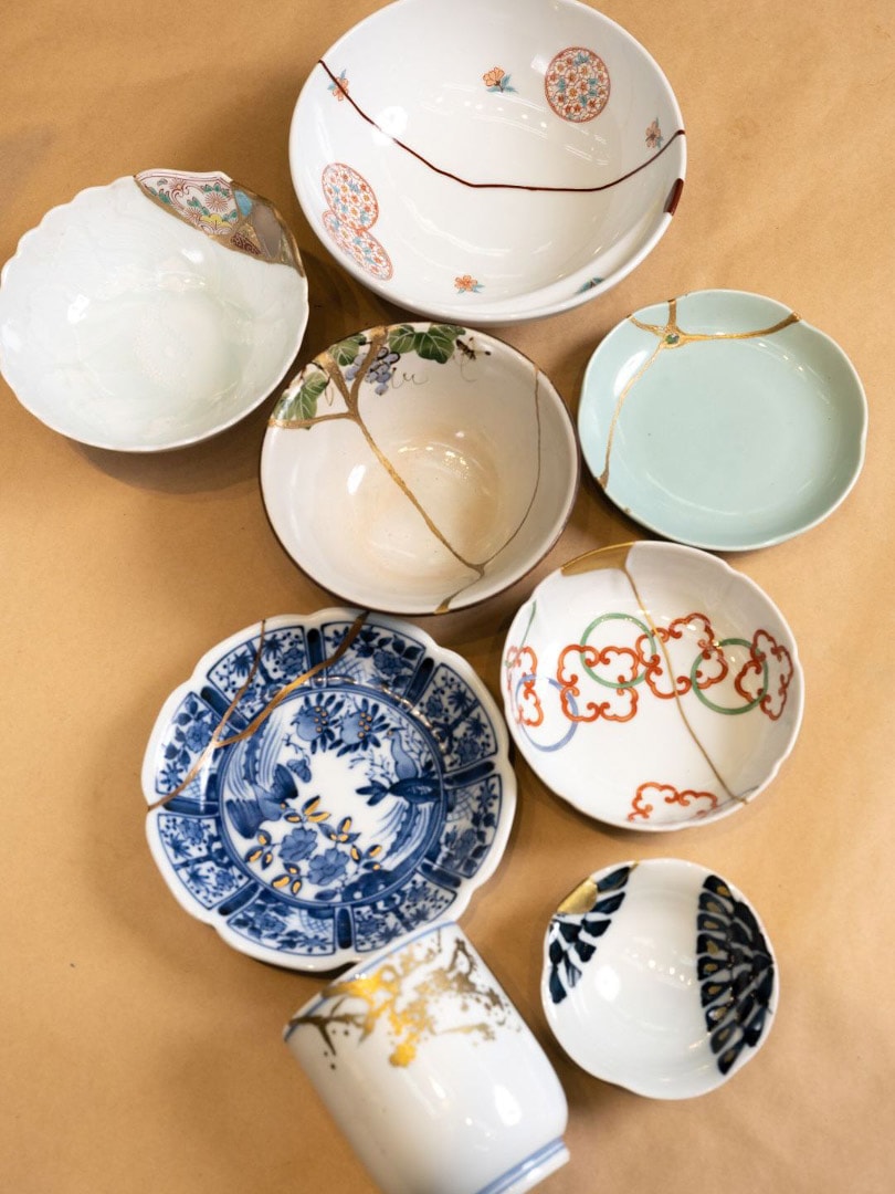 金継ぎを施した器の数々。壊れたものを修復することで貴重な一点ものになる。