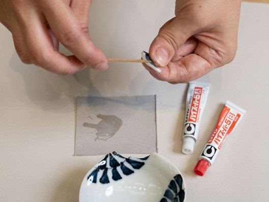 ❶厚紙の上で2種の陶磁器用接着剤をよく混ぜあわせ、割れた陶磁器の断面に爪楊枝などで薄く付けていく。