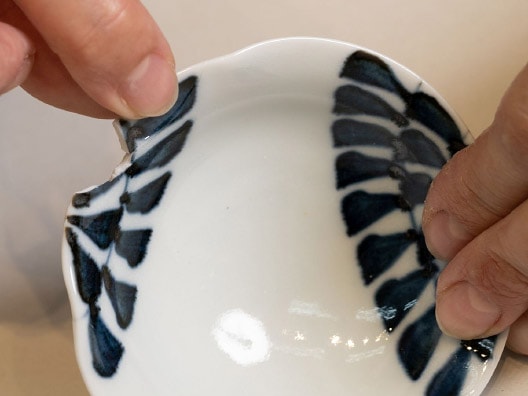 金継ぎとは、割れたり欠けたりした陶磁器を漆で接着し、継ぎ目に金や銀などを蒔(ま)いて飾る修復方法のこと。漆を使った修復は縄文時代の土器に見られるが、金で装飾する金継ぎは、室町時代に盛んになった茶の湯の文化とともに成熟した技法といわれている。当時の茶人は、修復した部分を「川の流れ」などと称して愛で、不完全なもののなかに新たな美を見出した。
