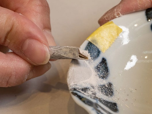 ❹エポキシパテが十分に固まったら空(から)研ぎペーパーで滑らかにし、器の形状に違和感がなくなるまで磨く。研ぎかすはしっかりと拭き取る。