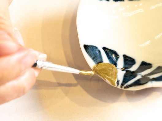 ❺合成漆と金粉(真鍮粉)、うすめ液を混ぜあわせ、面相筆で接着部分とパテで埋めた部分を隠すように塗っていく。塗った部分にふれないようにして持ち帰り、自宅で5日~1週間室内で乾燥させる。