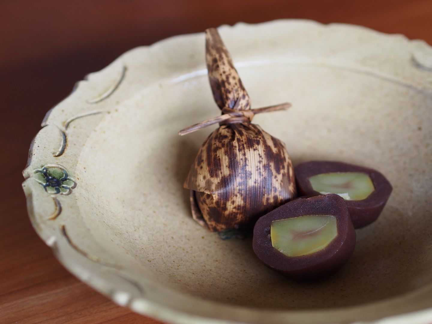 渋皮煮の栗を蒸し羊羹で包み、最後に竹皮で包んだ栗蒸し羊羹。秋のレッスンでの一例。