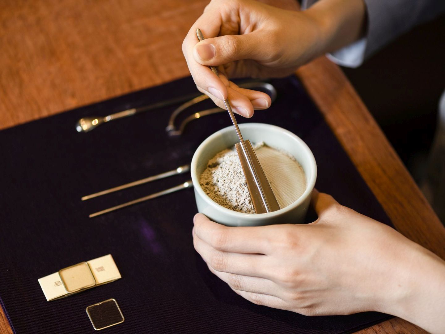 聞香実践体験で、聞香炉の灰のなかに香炭団(こうたどん)を埋め、灰押で灰山を円錐形に整える所作。