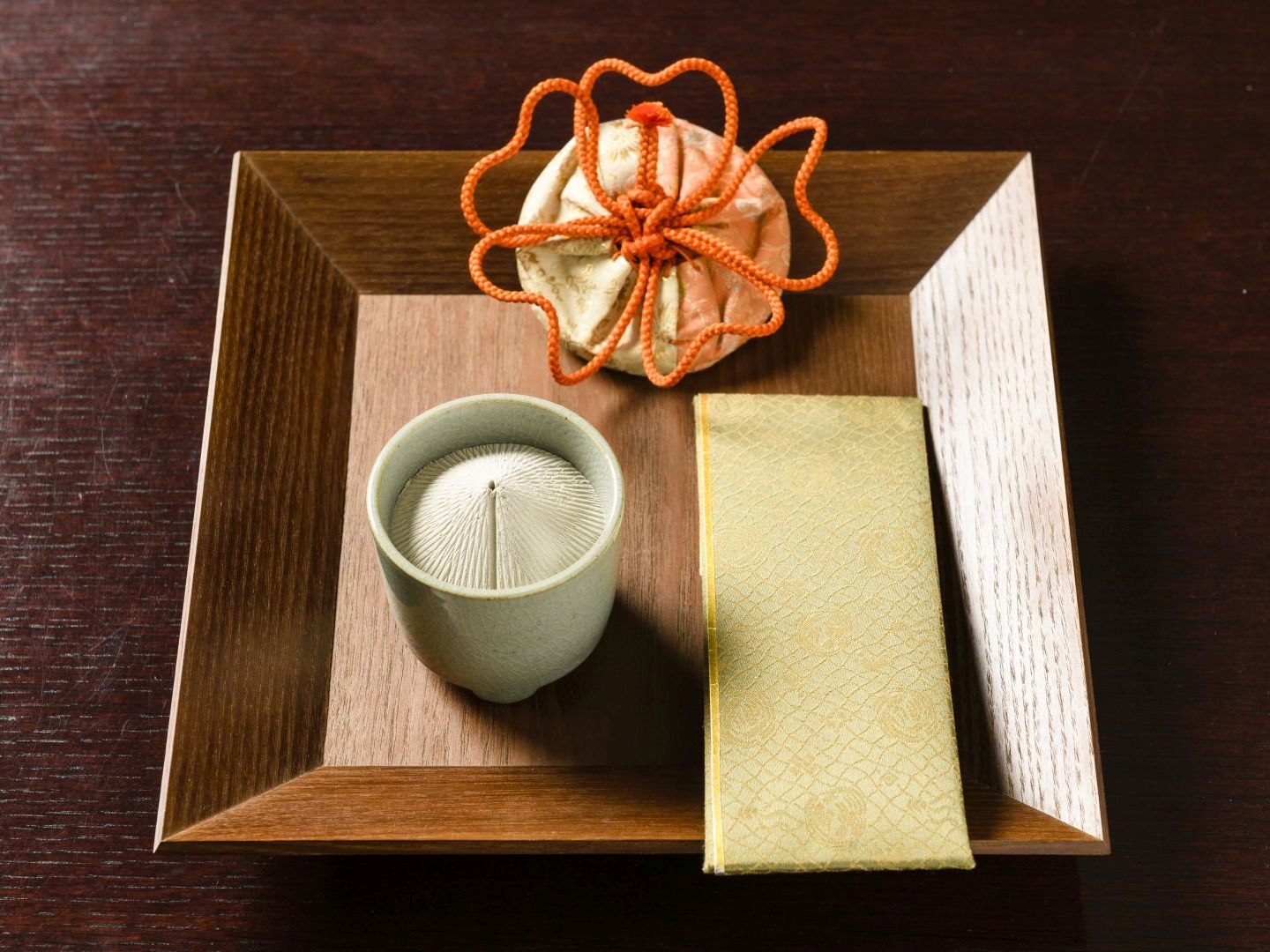 聞香炉(ききごうろ)、火箸や灰押(はいおさえ)などの道具が入った源氏香体験の一式。