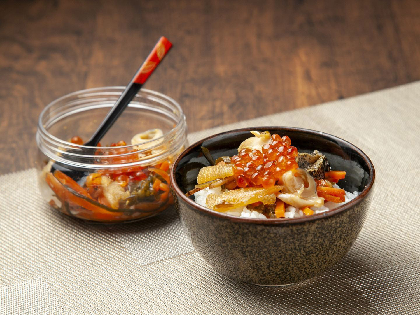 イクラ、ツブ貝、メカブ、数の子などをふんだんに使い、昆布と特製調味液でまろやかに仕上げた、福島県の老舗漬物店の人気商品。すべて手作業で丁寧につくられている。スルメと細切りにした人参でつくる福島県のソウルフード「いか人参」を思わせるが、よりぜいたくで海の恵みのうまみと食感が調和した、年齢問わず愛される逸品だ。