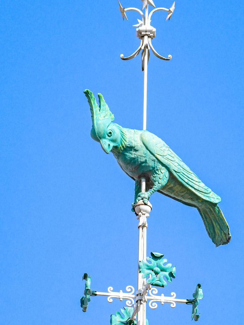 ルーフの上の尖塔には市場のシンボル、オウムの姿。売り手のにぎやかなおしゃべりを象徴しているといわれている。