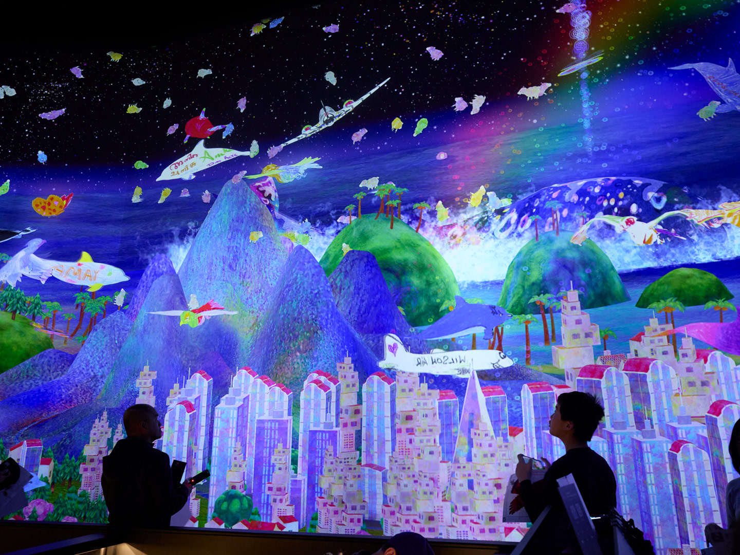 自分で描いた絵が巨大スクリーンに飛び立つ。スマートフォンでアプリを起動し、それぞれの視点で操縦することもできる。