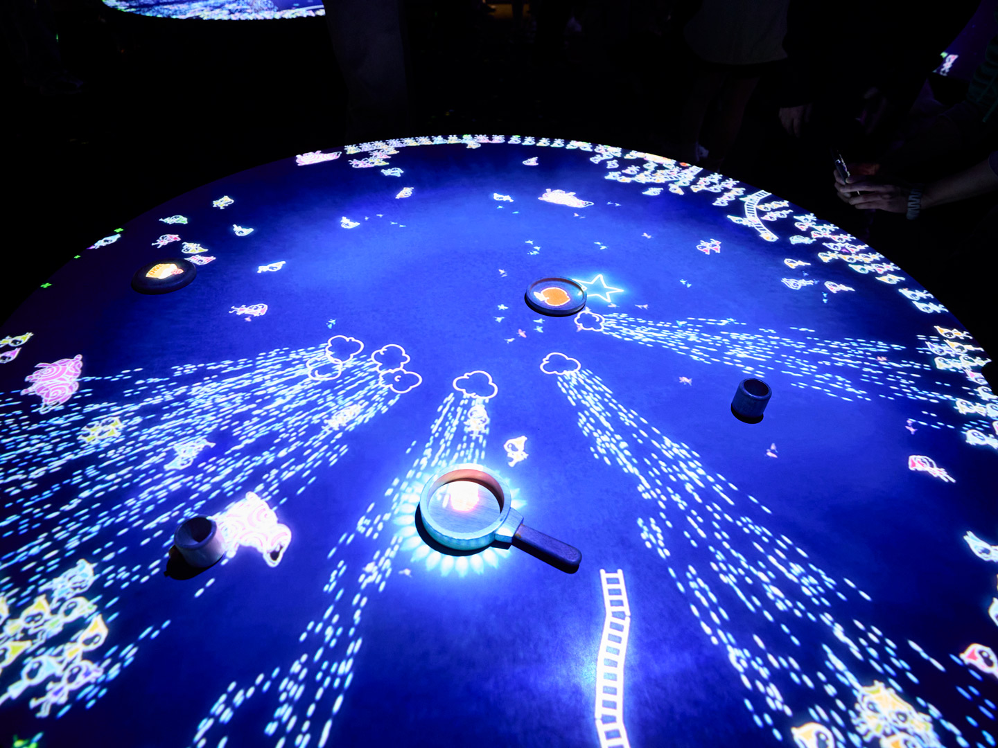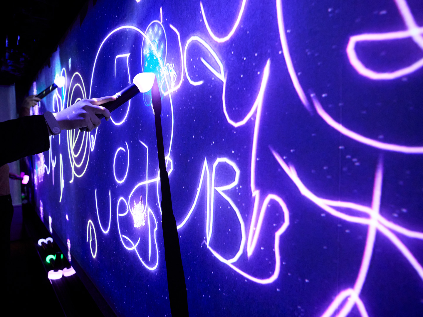 「こびとが住まう宇宙の窓」では、専用の光のペンで壁に絵を描くと、こびとたちが反応して動き出す。遊びながら音と動きの関係を体感できる。