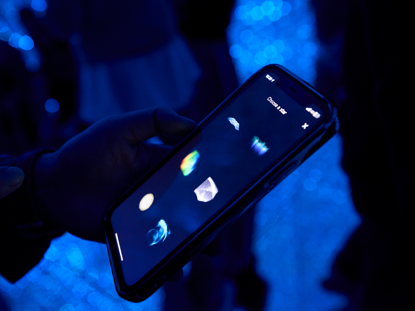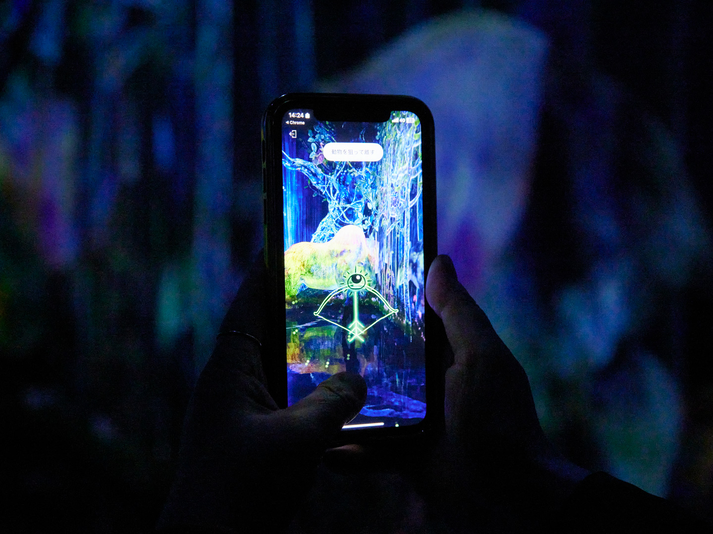 「The Infinite Crystal Universe」では、スマートフォンを使って自ら選んだエレメントを空間に投げ込むことができる。そのエレメントは立体的な“光の彫刻”として現れる。