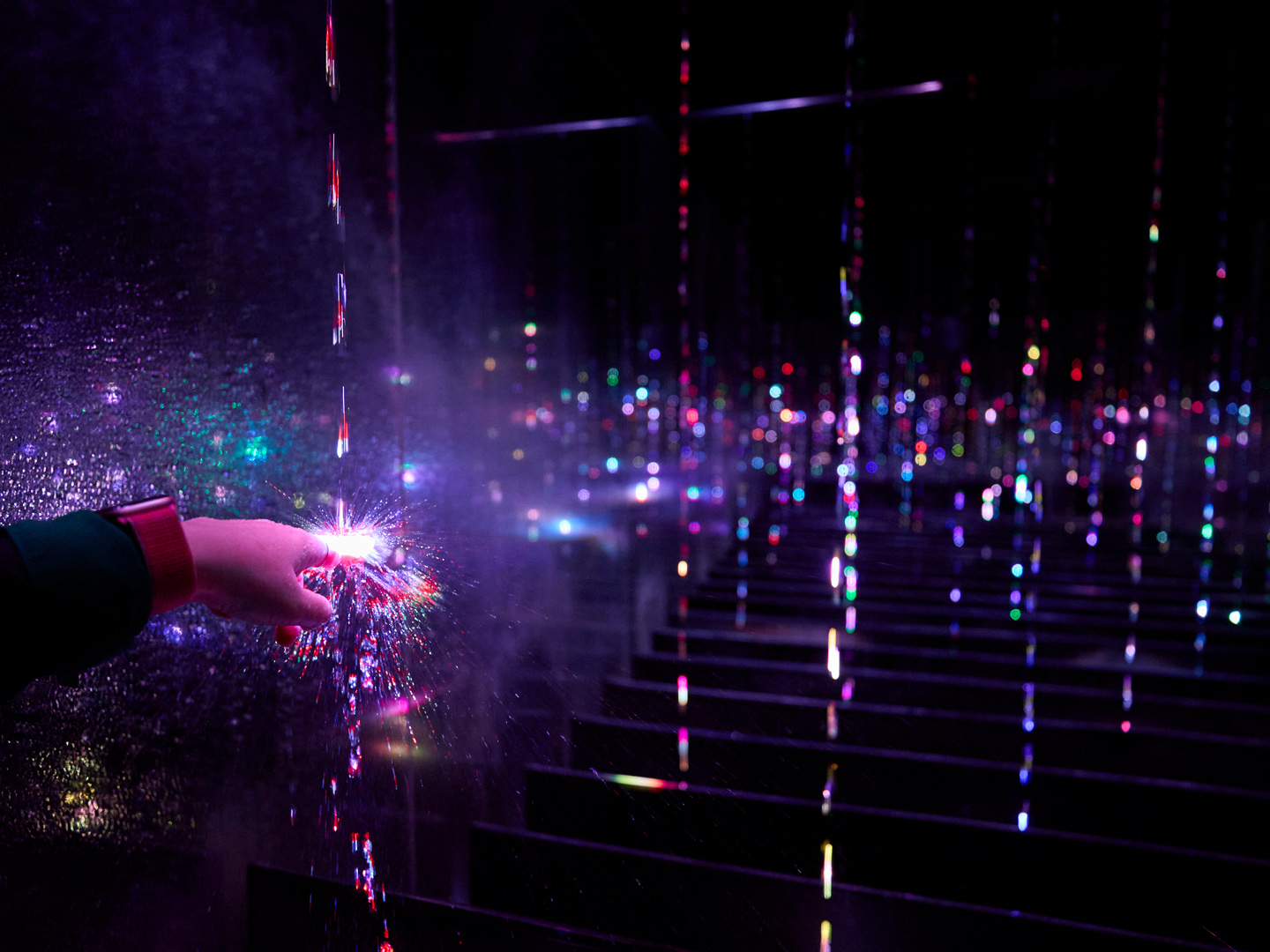 無数の光が空中に浮遊し、触れると弾けて空間に広がる作品「生命は結晶化した儚い光」。