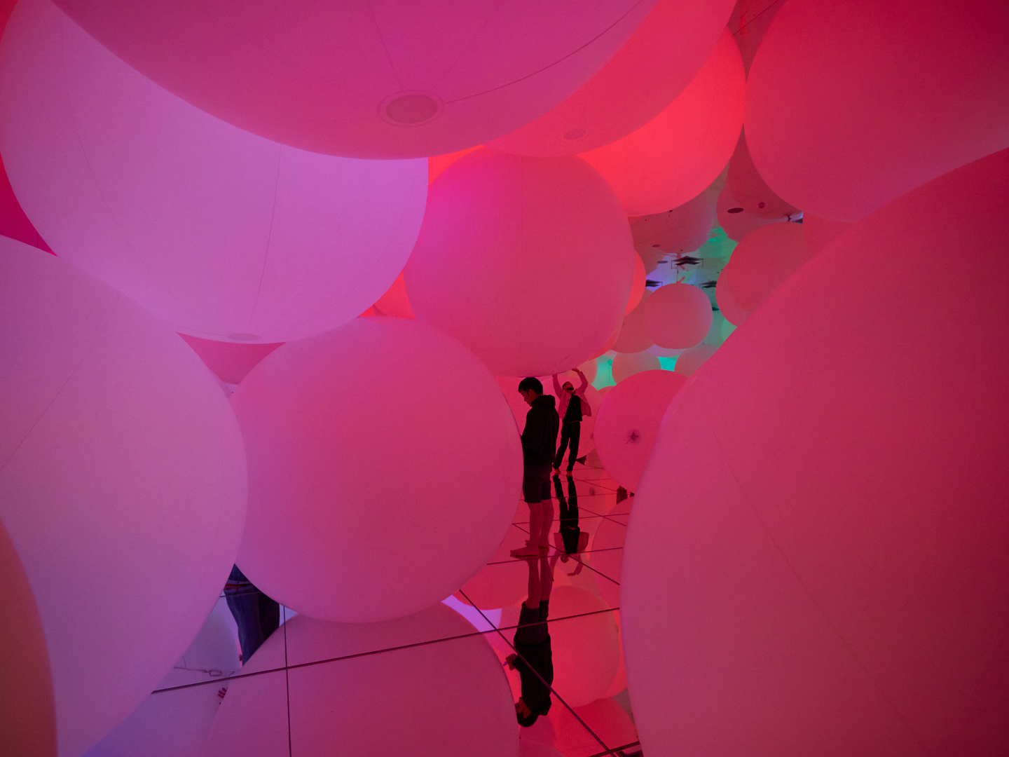 無数の大きな球体が空間を満たし、触れると色と音が変化する「変容する空間、広がる立体的存在 - 平面化する3色と曖昧な9色」。