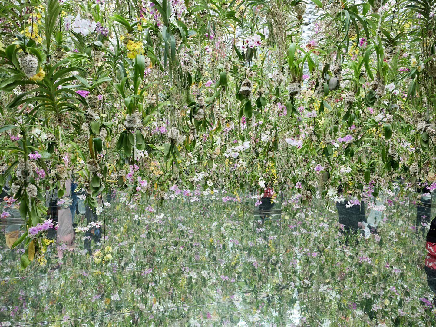 天井から吊るされた1万3,000株以上の蘭の花が上下に動く「Floating Flower Garden:花と我と同根、庭と我と一体」。鏡張りの床に花々が映り込むことで、幻想的な世界へと変容する。