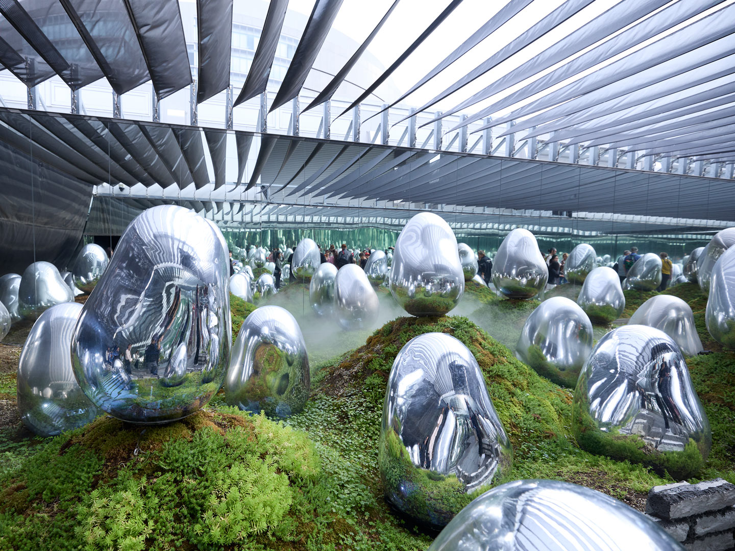苔庭に並ぶ卵形のオブジェが、風や人の動きに反応して光と音を放つ「呼応する小宇宙の苔庭 - 固形化された光の色, Dusk to Dawn」。