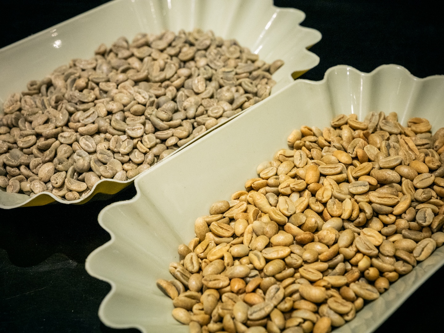 グリーンビーンズ(生豆)という名の通り、緑がかった状態で輸入。発酵度合いで色が異なる。これを焙煎してコーヒー豆として仕上げる。