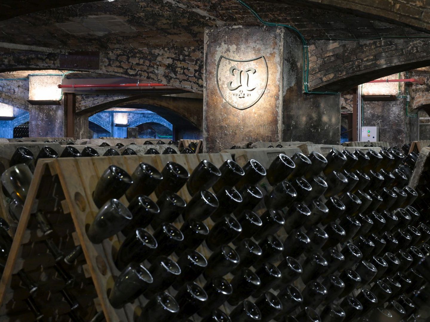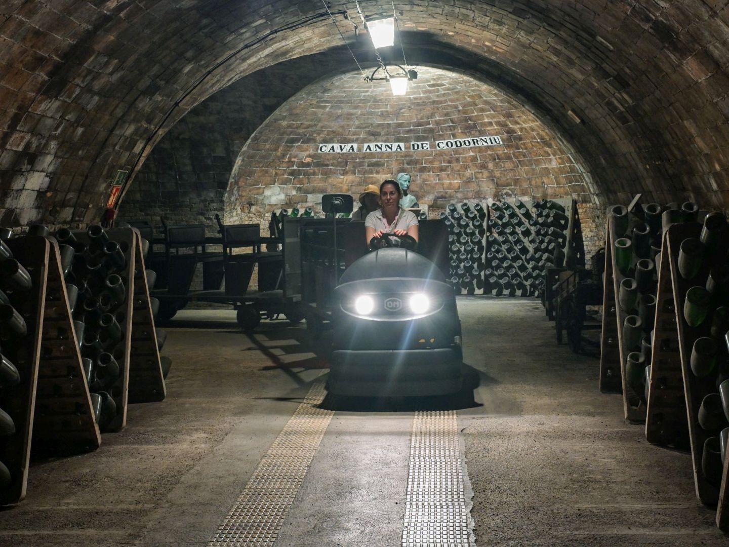 この先にさらなる驚きが待っている。巨大な地下貯蔵庫の見学だ。階段を下りるごとに空気がひんやりする。この地下貯蔵庫はなんと、総延長約30キロメートルに及ぶ。そのため見学はトロッコ列車に乗って行う。瓶がずらりと並ぶなかを、トロッコ列車に揺られて進むのはちょっとした冒険気分だ。