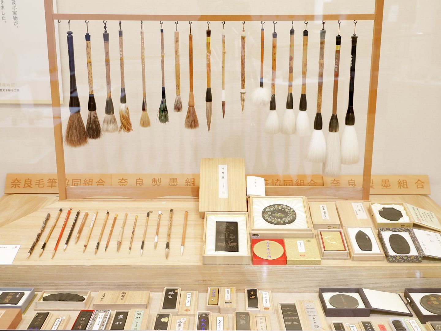 空海が日本に伝えたという奈良筆など、各工芸品を解説する常設展示室。筆の穂先に使う動物の毛にふれられるなど、工芸品の特徴がわかるコーナー展示も。