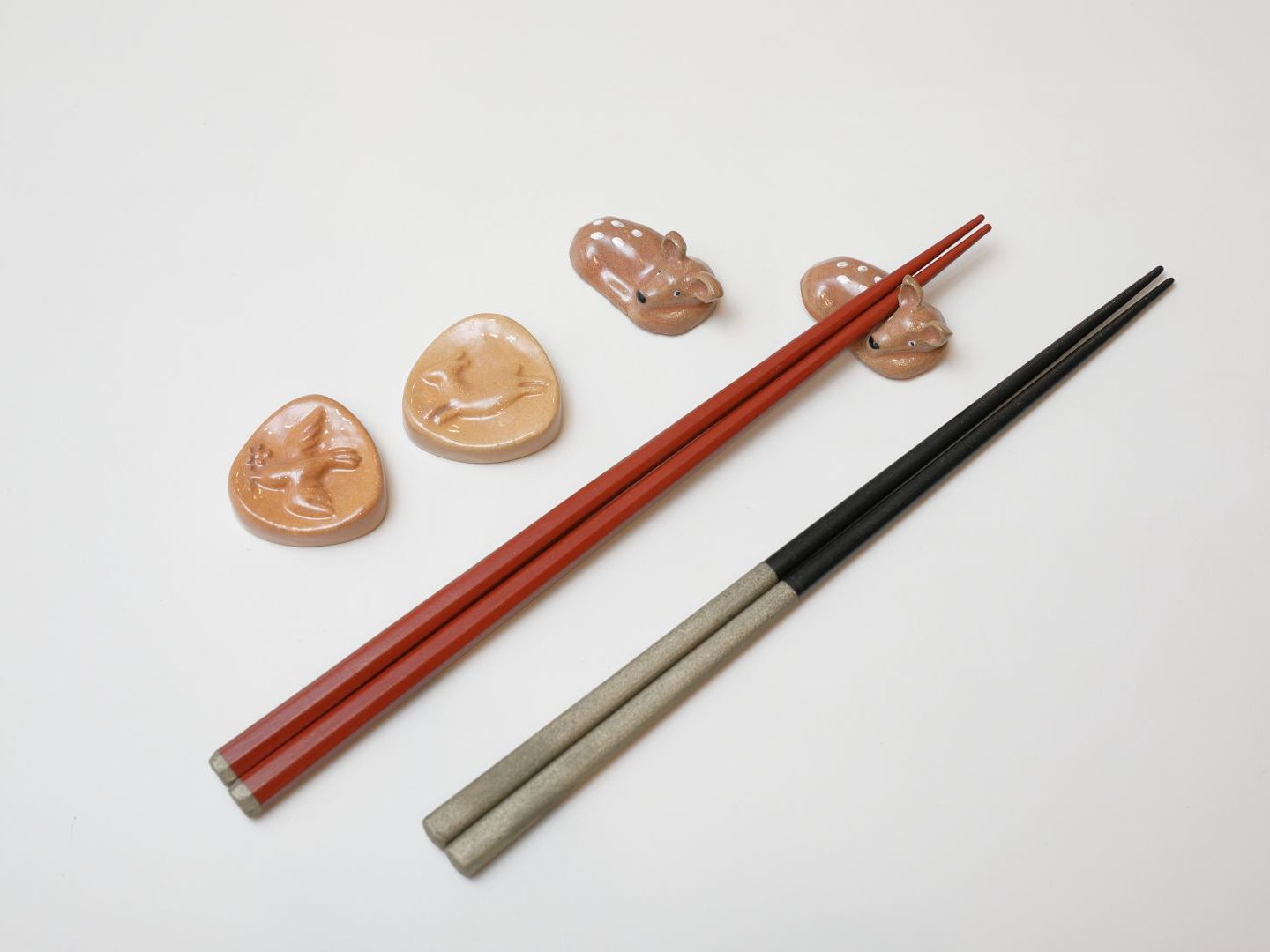 販売コーナーで扱っている、漆作家・阪本 修氏の「うるしのおはし」(1膳・3,740円~)と、赤膚焼作家・大塩まな氏の「箸置」(各550円)、大塩玉泉氏の「鹿箸置」(各1,000円)。