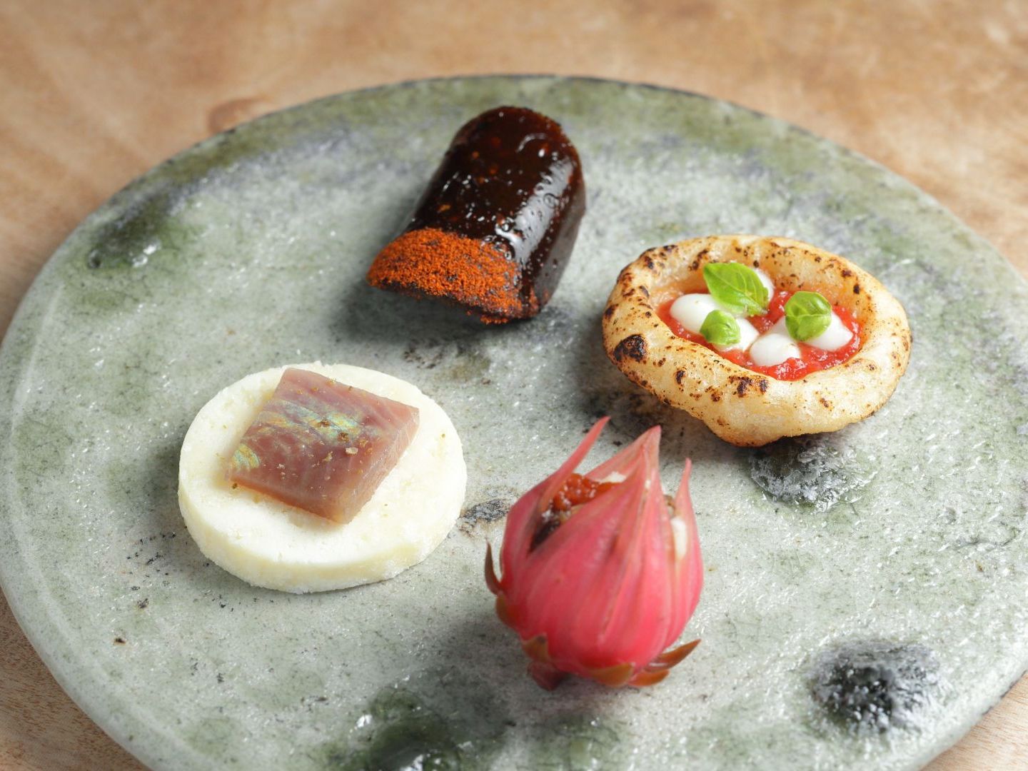 「十津川ゆべし パプリカのアクセント」(奥)など、“ようこそ奈良”をテーマにしたフィンガーフードからスタート。コースは昼8,000円~、夜11,000円~(前日までに要予約)。