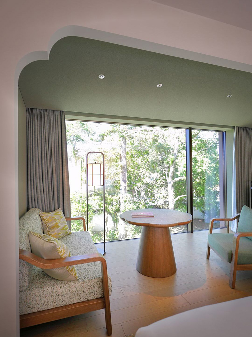 なかでもホテルメイン棟は、1951(昭和26)年、昭和天皇が奈良巡幸中にサンフランシスコ講和条約と日米安全保障条約の批准書に署名した部屋「御認証の間」など、歴史の舞台にもなった。当時の雰囲気が感じられる、上品な調度を配した隣部屋のラウンジも利用したい。また、レストランは知事公舎の客間を修復・再生。庭園が屏風のように見渡せる空間で奈良の魅力にあふれた食を体験できる。隈 研吾氏設計の宿泊棟は全43室の客室を備え、そのうち23室は温泉風呂付。いずれも奈良の自然を感じさせる色合いでまとめられている。