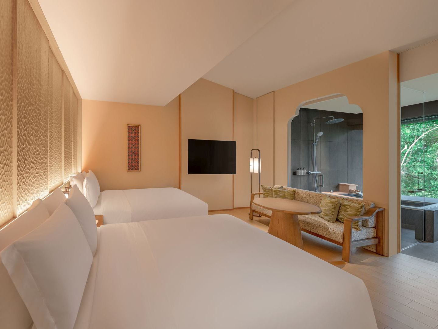 床まである窓からの景色と室内のデザインが調和した「スタンダードルームツイン」(1泊12万6,500円~・室料・サービス料込)。「いばら」をあしらった仕切りの意匠も印象的。
